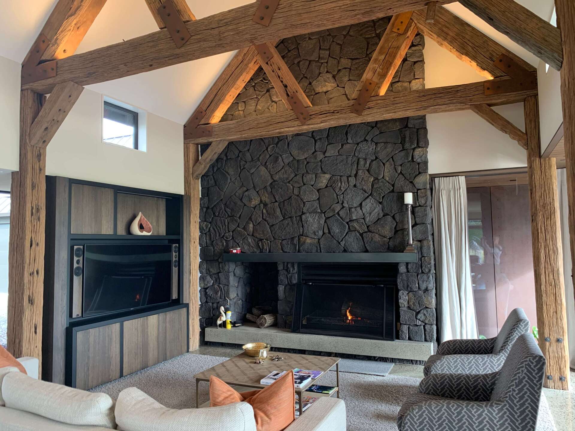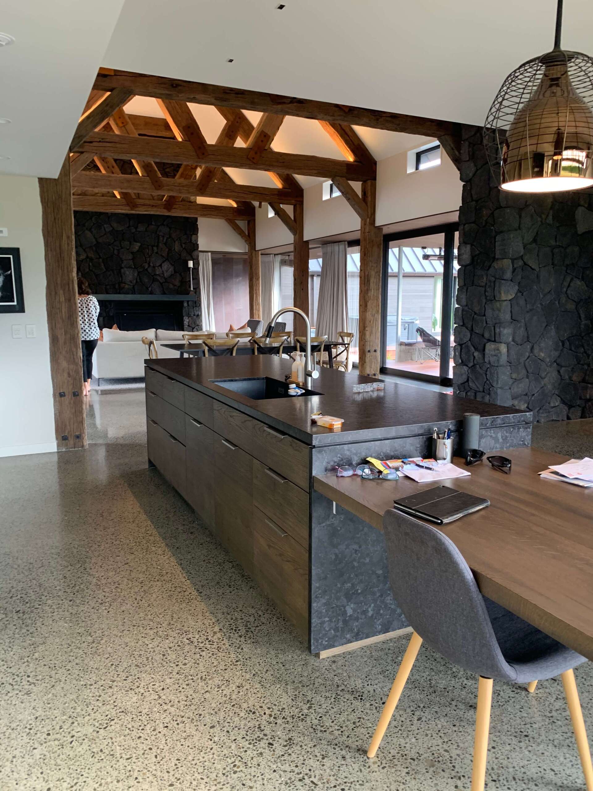 Louie McKenzie Builders completed the technical build. The owners were heavily involved in the home’s interior design, which included kauri timber trusses and beams and high vault ceilings.