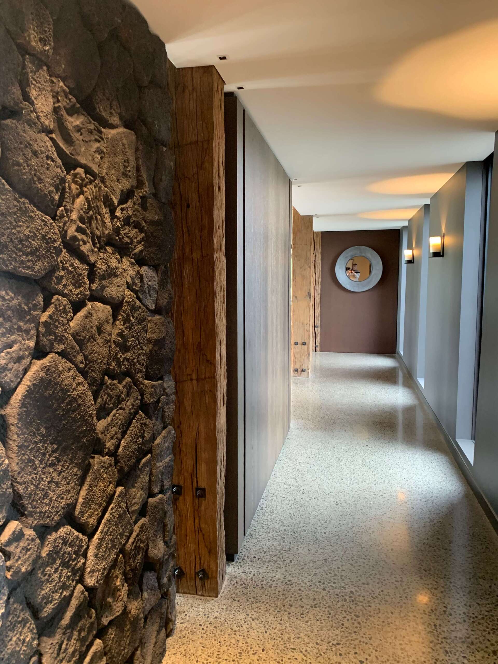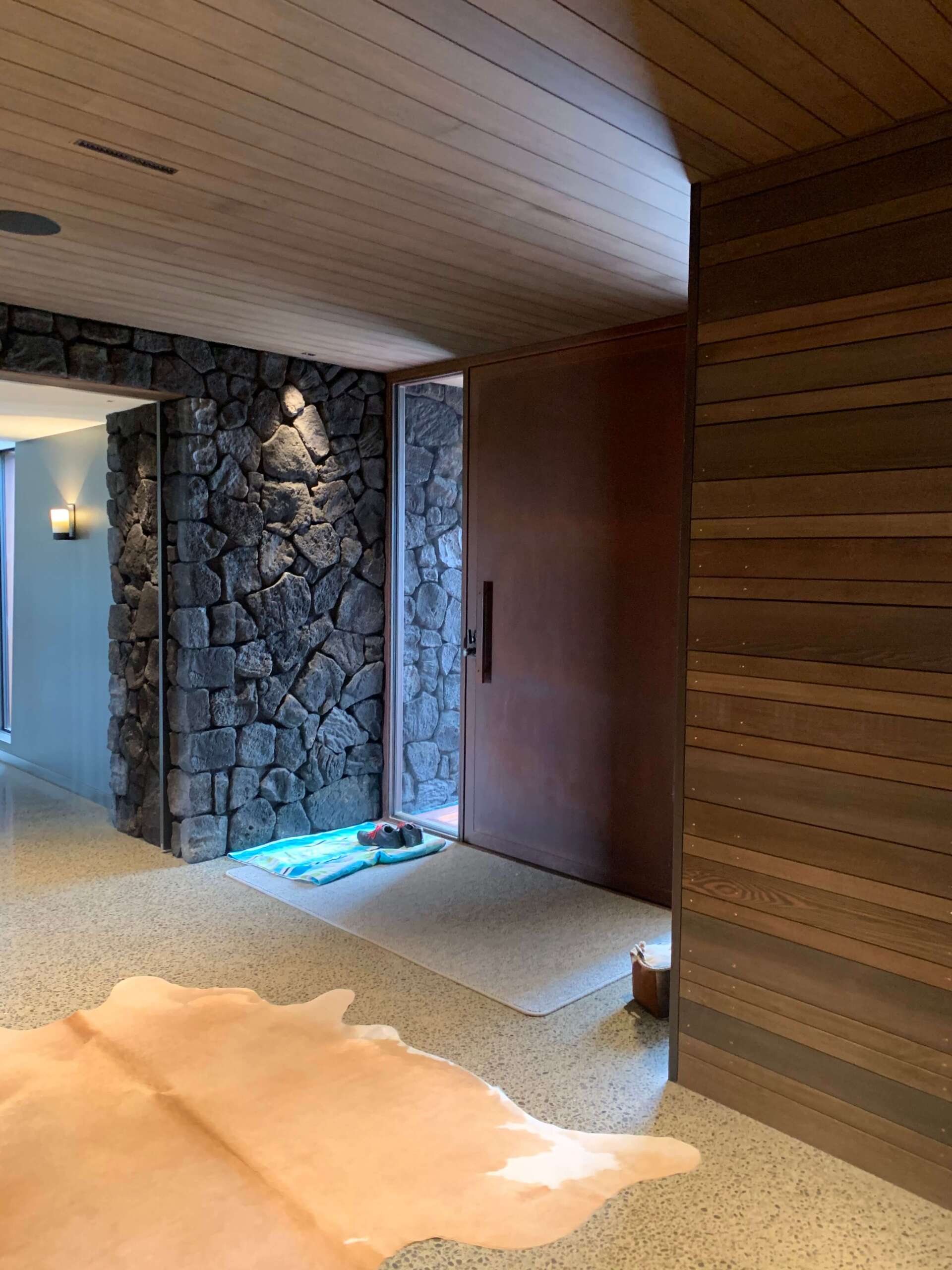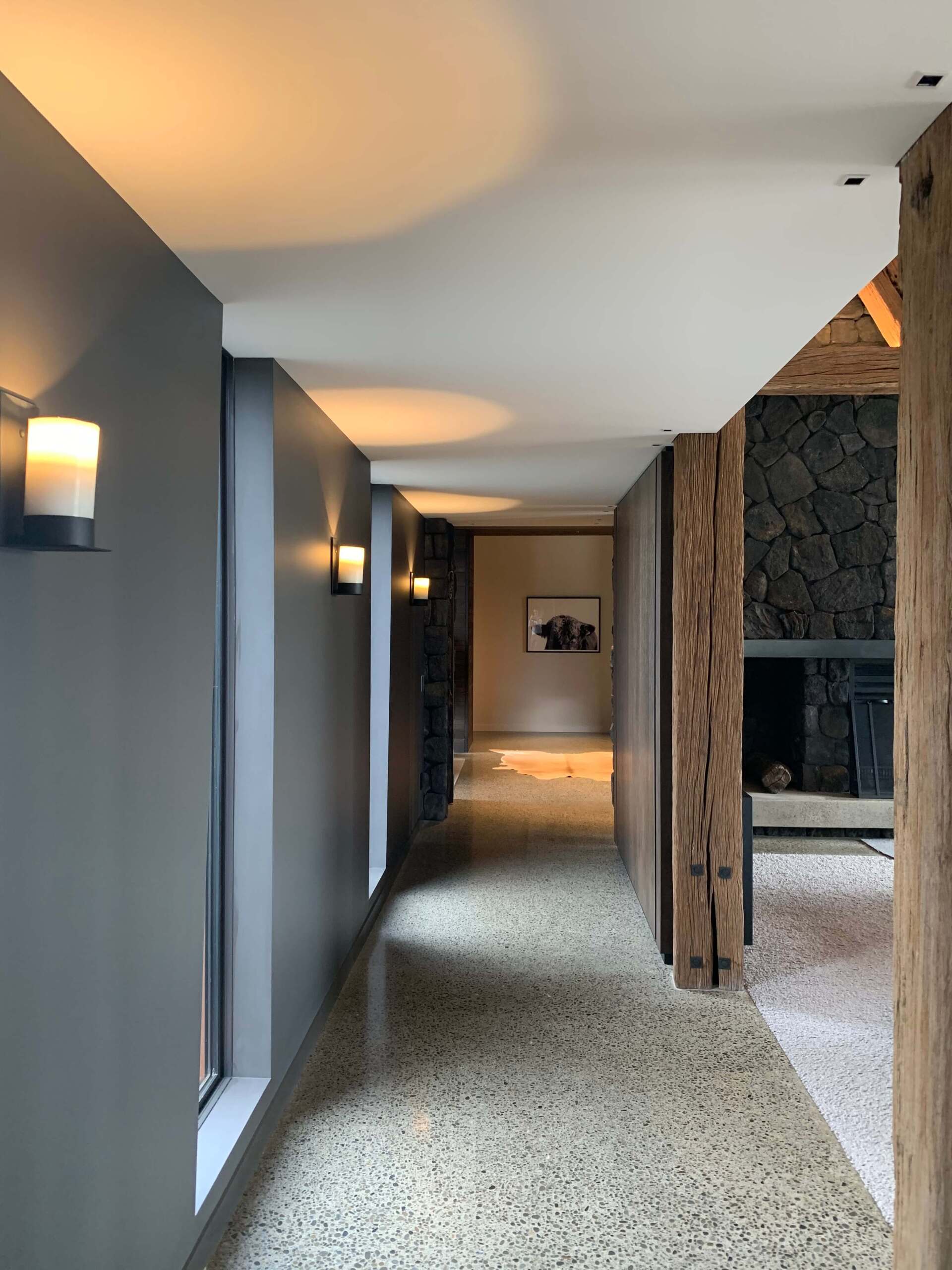 Having sold the farm, The Shadbolt’s wanted to retire into a large footprint, expansive, rustic style fortress. Complete with stone and timber feature walls and native timber interior beams.